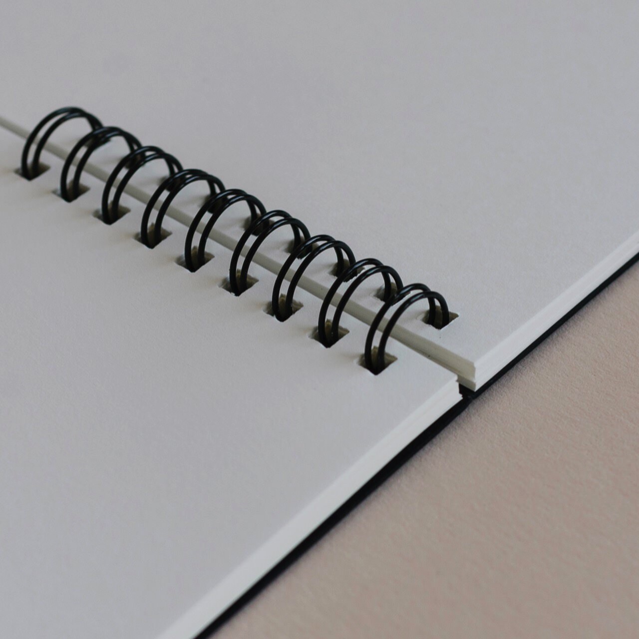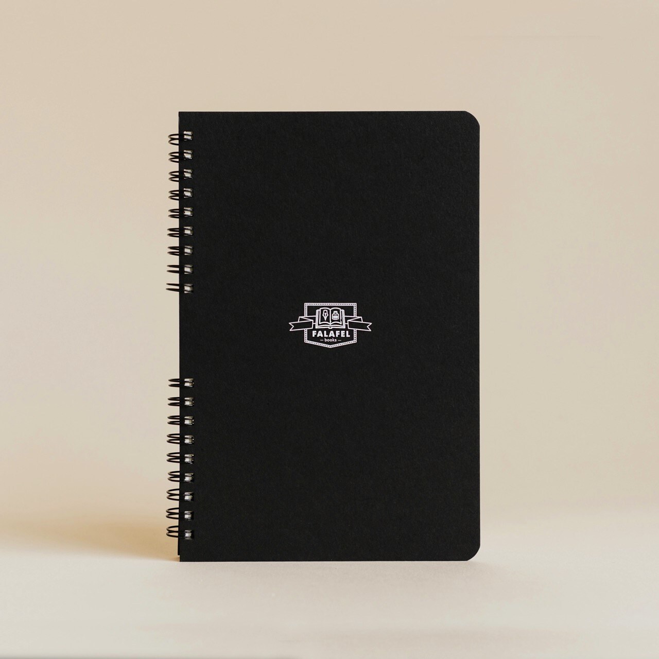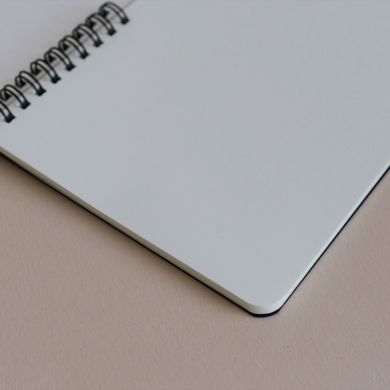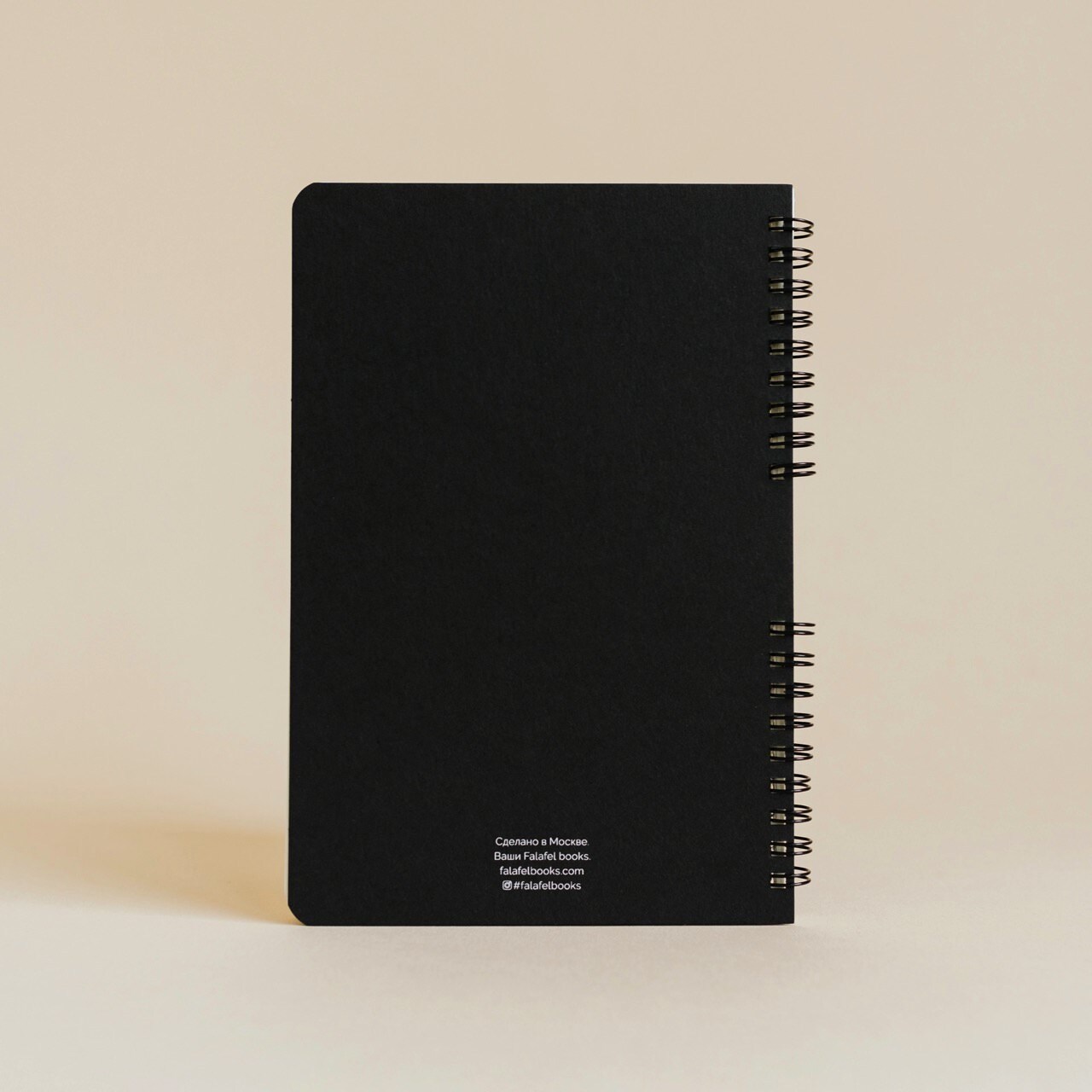 Блокнот на пружине с твердой обложкой А5 (138 X 200 мм) без разметки. 60 листов натурально-белой бумаги 80 г/м2, крепление на на две черные пружинки. Лицевая и задняя обложка выполнены из плотного черного картона (600 г/м2).