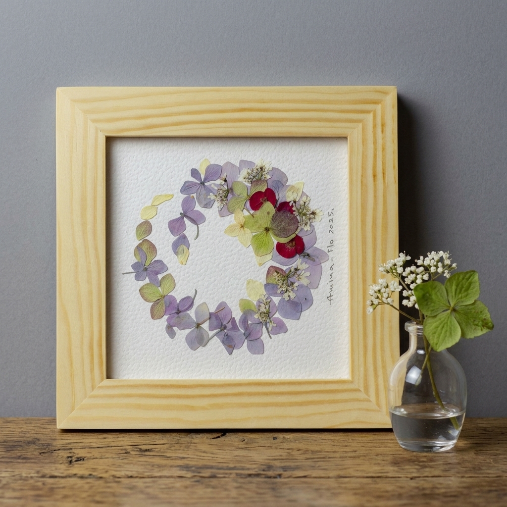 Миниатюрная работа, собранная из подлинных цветов гортензии и молочая. За счет прозрачности лепестков композиция выглядит легкой, почти акварельной.