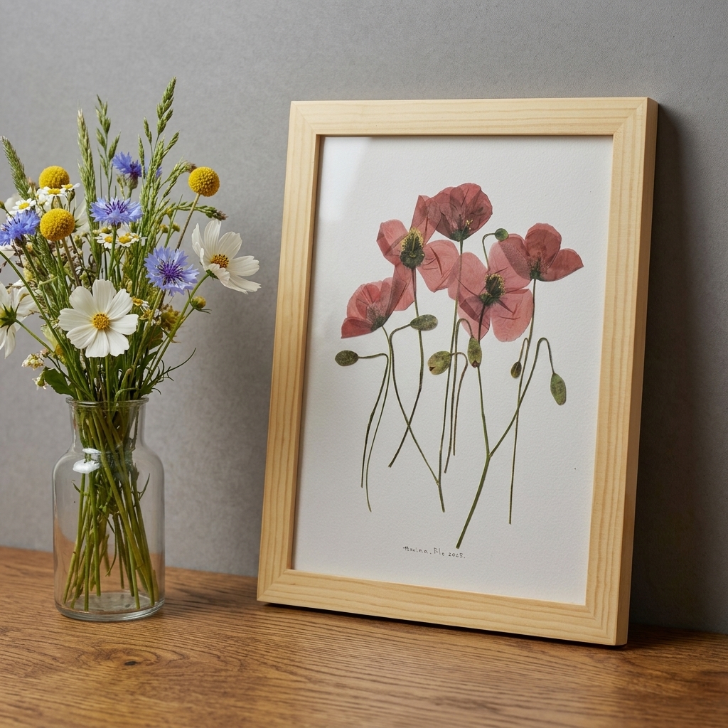 Работа выполнена из подлинных цветов мака. Лепестки сохраняют естественную прозрачность и мягкую фактуру, за счет чего цветы выглядят почти живыми.