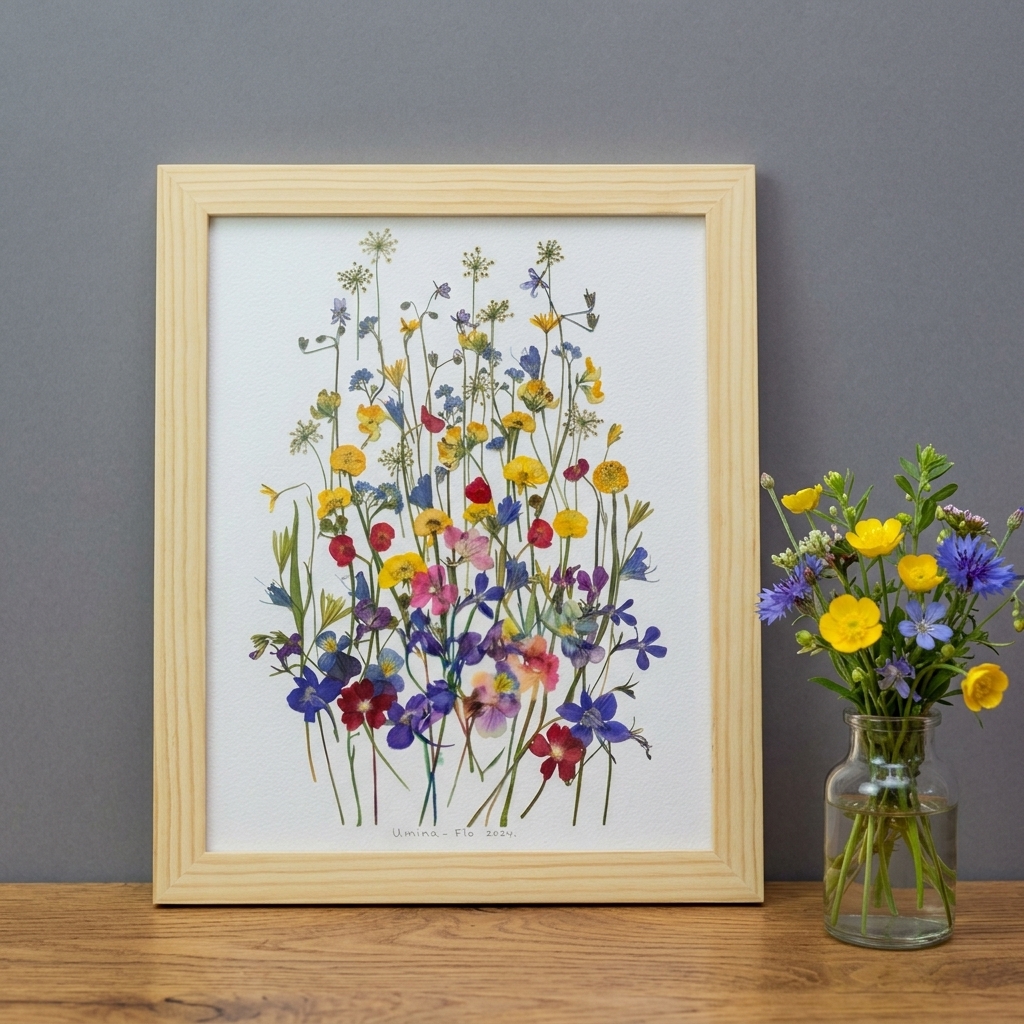 Каждый элемент размещается вручную. Цветы отличаются по размеру, форме и насыщенности, поэтому повторить такую композицию невозможно. Работа воспринимается как цельный фрагмент природы, перенесенный в графическую плоскость.