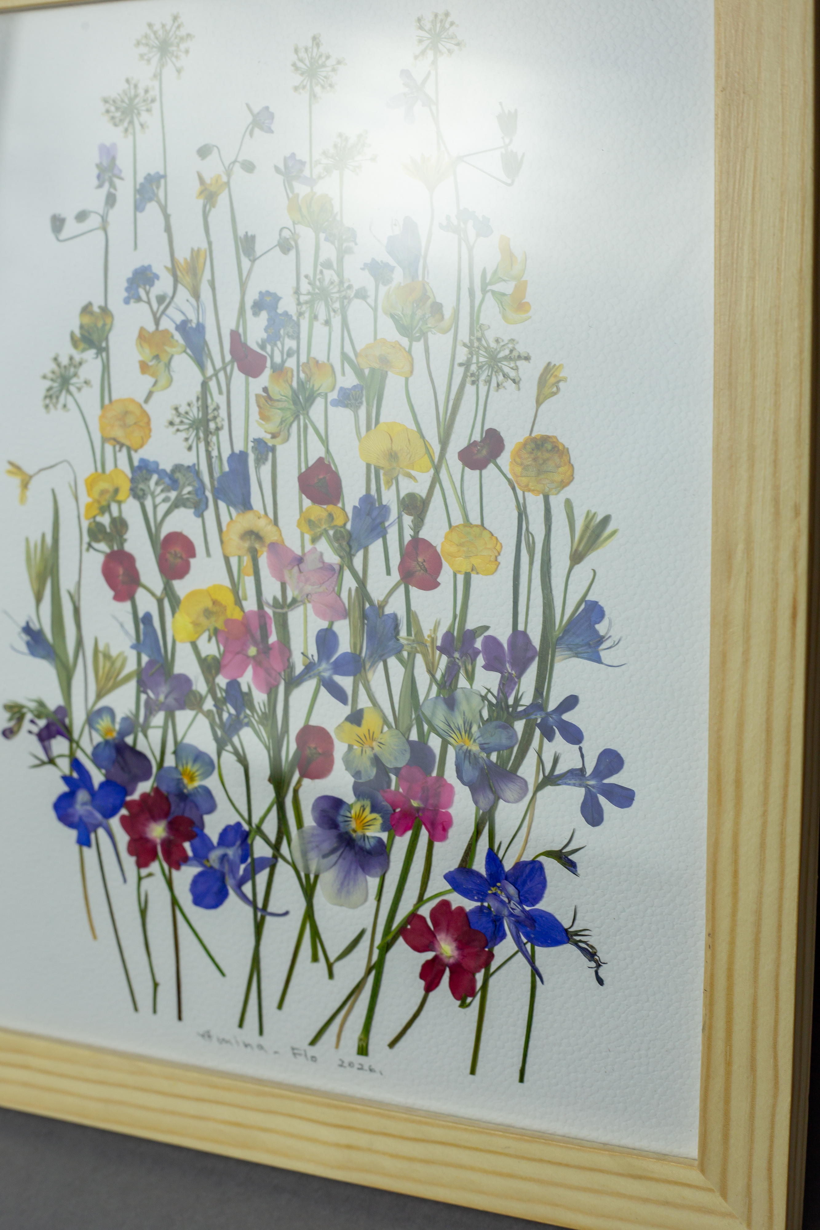 100% Натуральность: В работе использованы подлинные цветы (незабудки, лютики, дельфиниум, вербена, гусиный лук). Цветы прошли процесс профессионального прессования. Мы сохранили их природную прозрачность лепестков и хрупкую графику стеблей. Эстетика ручной работы: Каждое растение уложено вручную, что делает картину единственной в своем роде. Повторить точный изгиб лепестка невозможно. Все цветы выращены и собраны с любовью в Кыргызстане