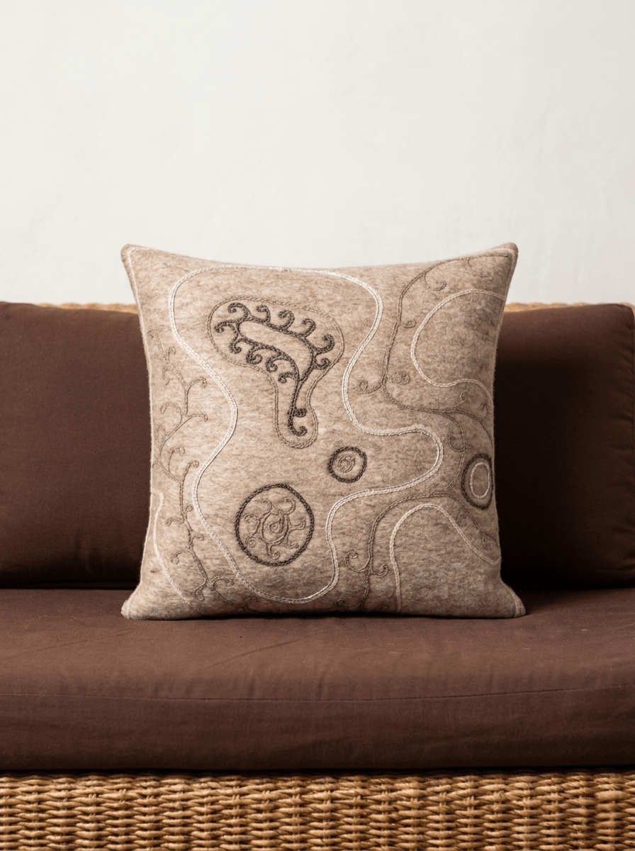 Чехол подушки оформлен орнаментом, вдохновленным природными и символическими мотивами кочевой культуры. Узор формируется вручную — путем вырезания и сшивания элементов из войлока или текстиля, создавая цельную композицию с мягкой графикой и гармоничным ритмом.