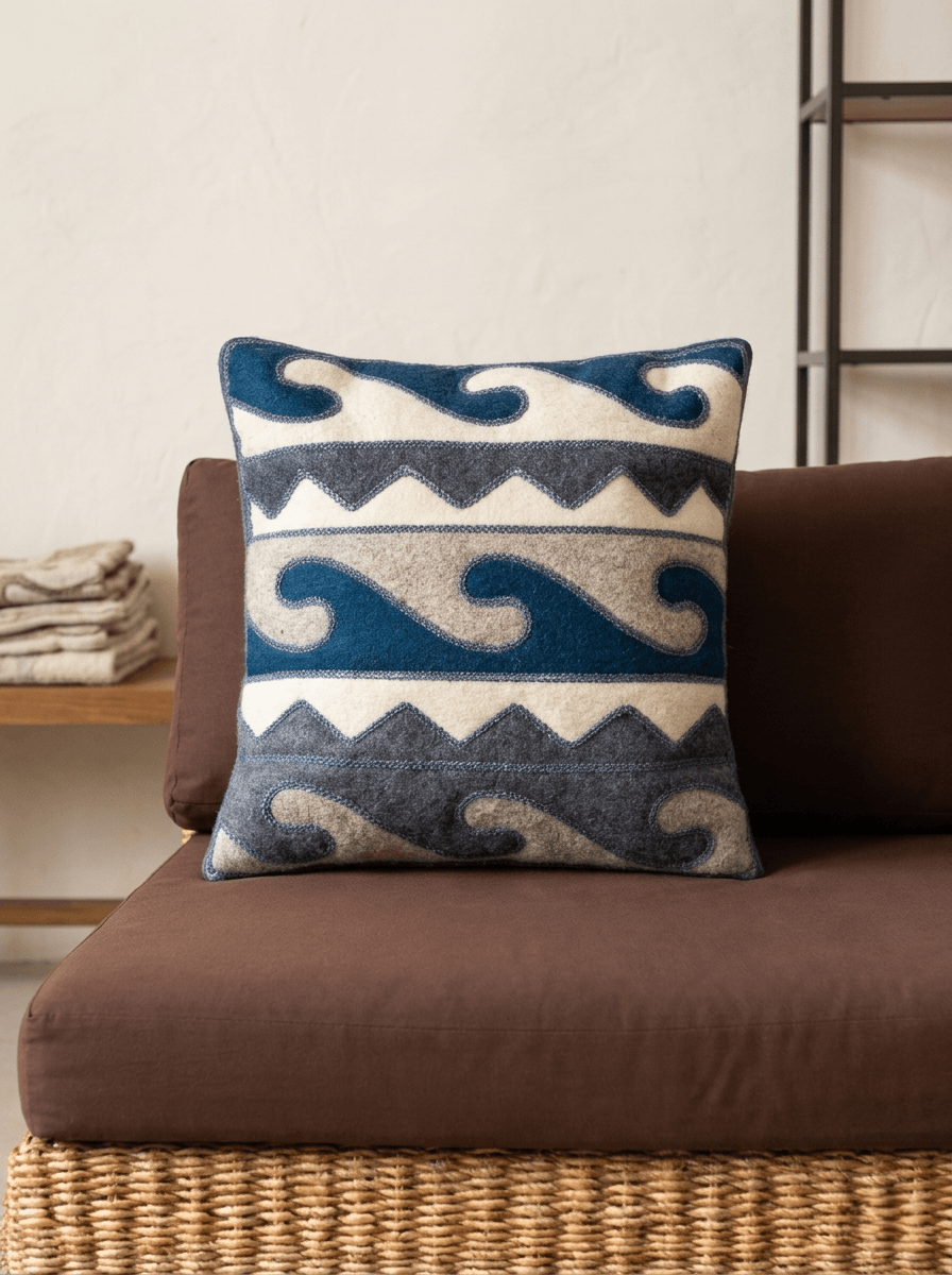 Чехол подушки оформлен орнаментом, вдохновленным природными и символическими мотивами кочевой культуры. Узор формируется вручную — путем вырезания и сшивания элементов из войлока или текстиля, создавая цельную композицию с мягкой графикой и гармоничным ритмом.