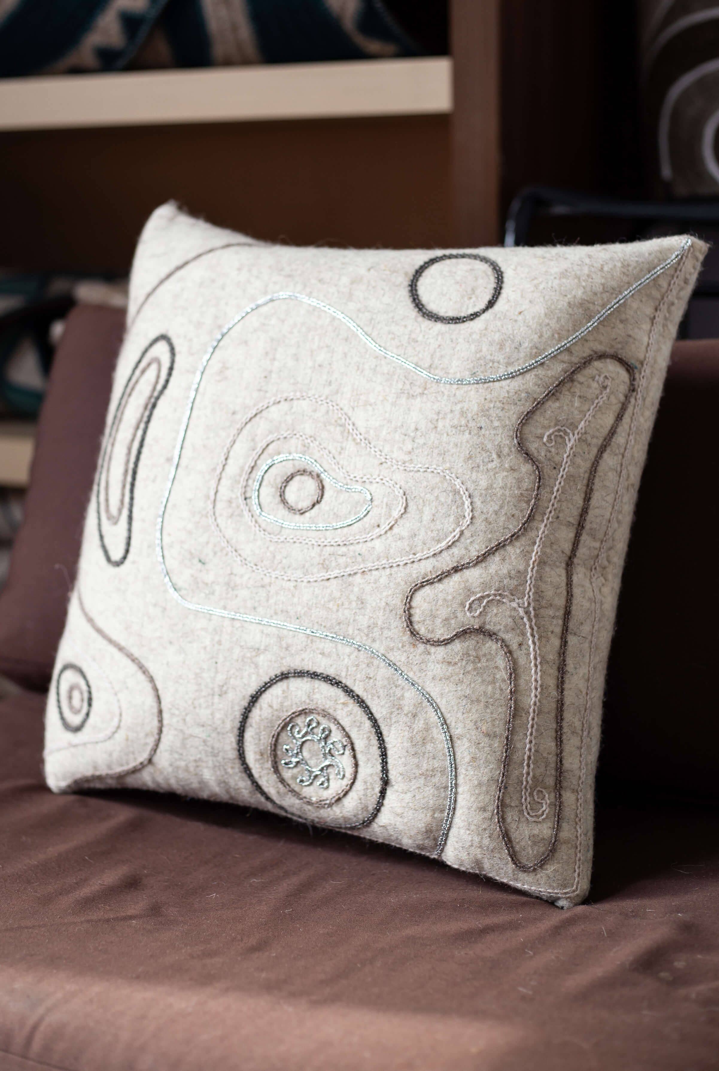 Чехол подушки оформлен орнаментом, вдохновленным природными и символическими мотивами кочевой культуры. Узор формируется вручную — путем вырезания и сшивания элементов из войлока или текстиля, создавая цельную композицию с мягкой графикой и гармоничным ритмом.