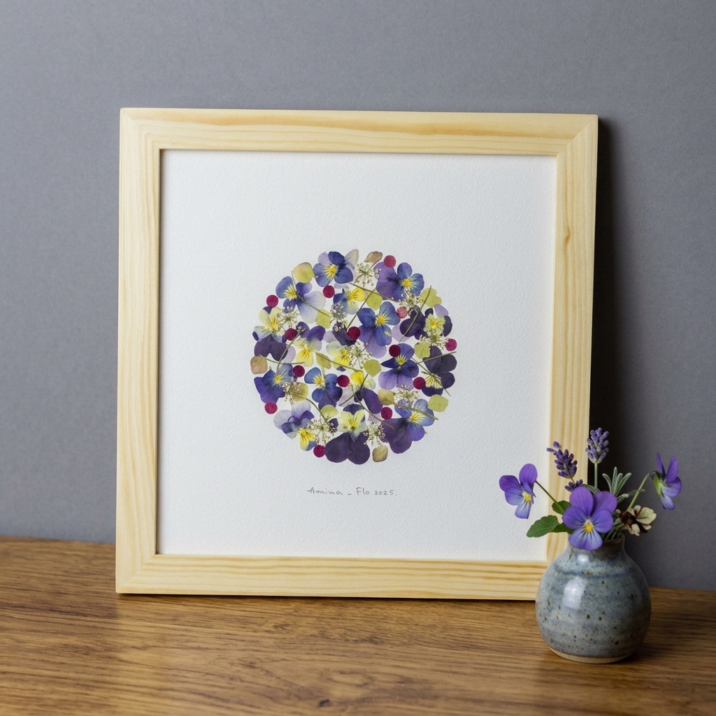 Композиция собирается вручную. Каждый лепесток и стебель укладываются отдельно, поэтому у каждой работы своя структура и рисунок. В данной работе композиция собрана в форме круга, что придает ей ощущение завершенности и баланса. Мелкие цветы и листья равномерно распределены внутри формы, создавая плотный, но легкий по восприятию рисунок с акцентами фиолетовых, желтых и розовых оттенков. Все цветы выращены и собраны с любовью в Кыргызстане.