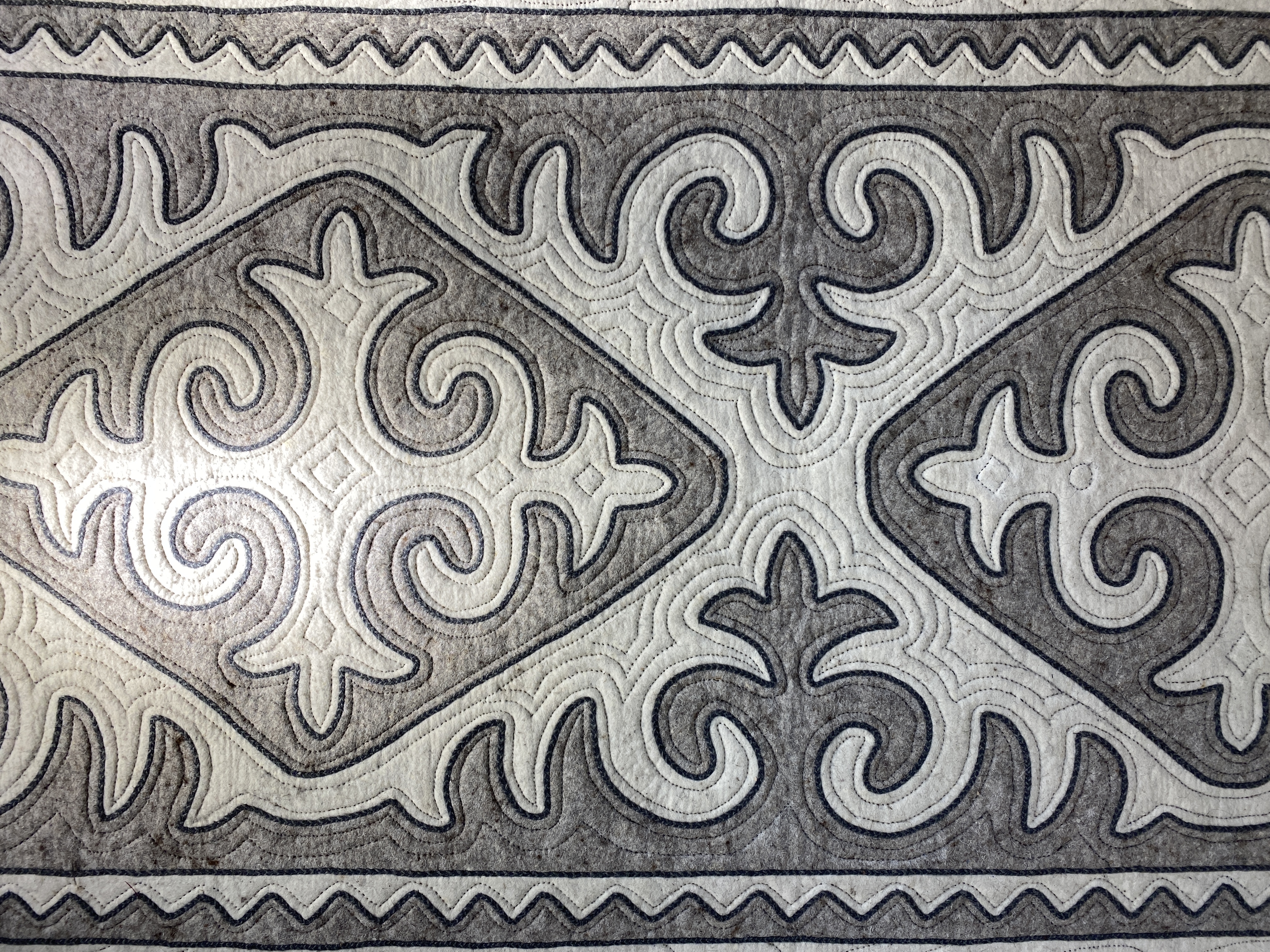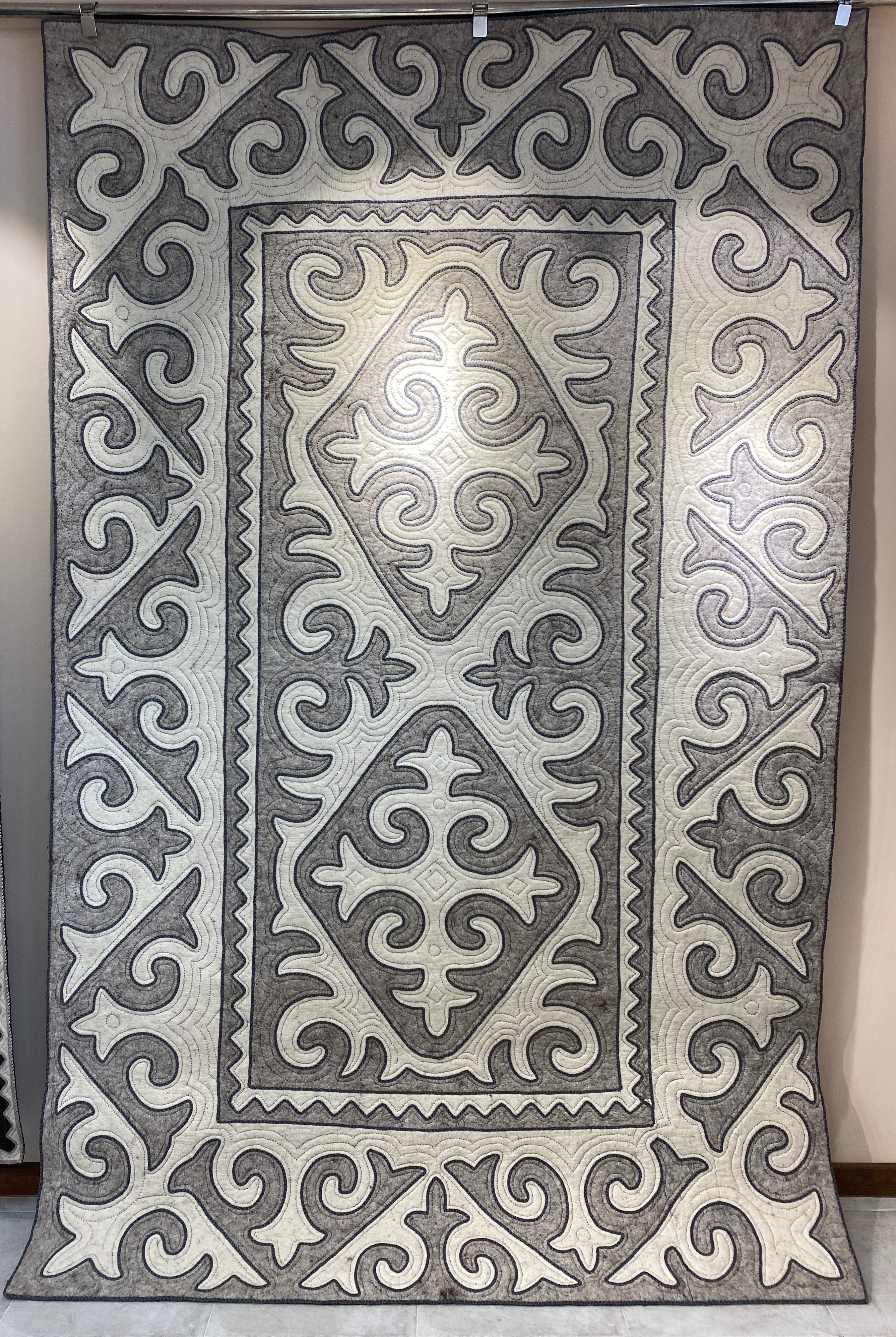 Орнамент вырезается и сшивается вручную, формируя симметричный узор. В композиции преобладают светлые и серые оттенки с мягкими переходами, создающими спокойную и сдержанную графику. Центральный рисунок построен вокруг двух крупных ромбовидных элементов, которые задают структуру и визуальный центр ковра. Боковые и крайние орнаменты формируют плотную рамку, усиливая ощущение устойчивости и баланса. Благодаря плотности и толщине шырдак хорошо сохраняет тепло и служит практичным покрытием для дома.