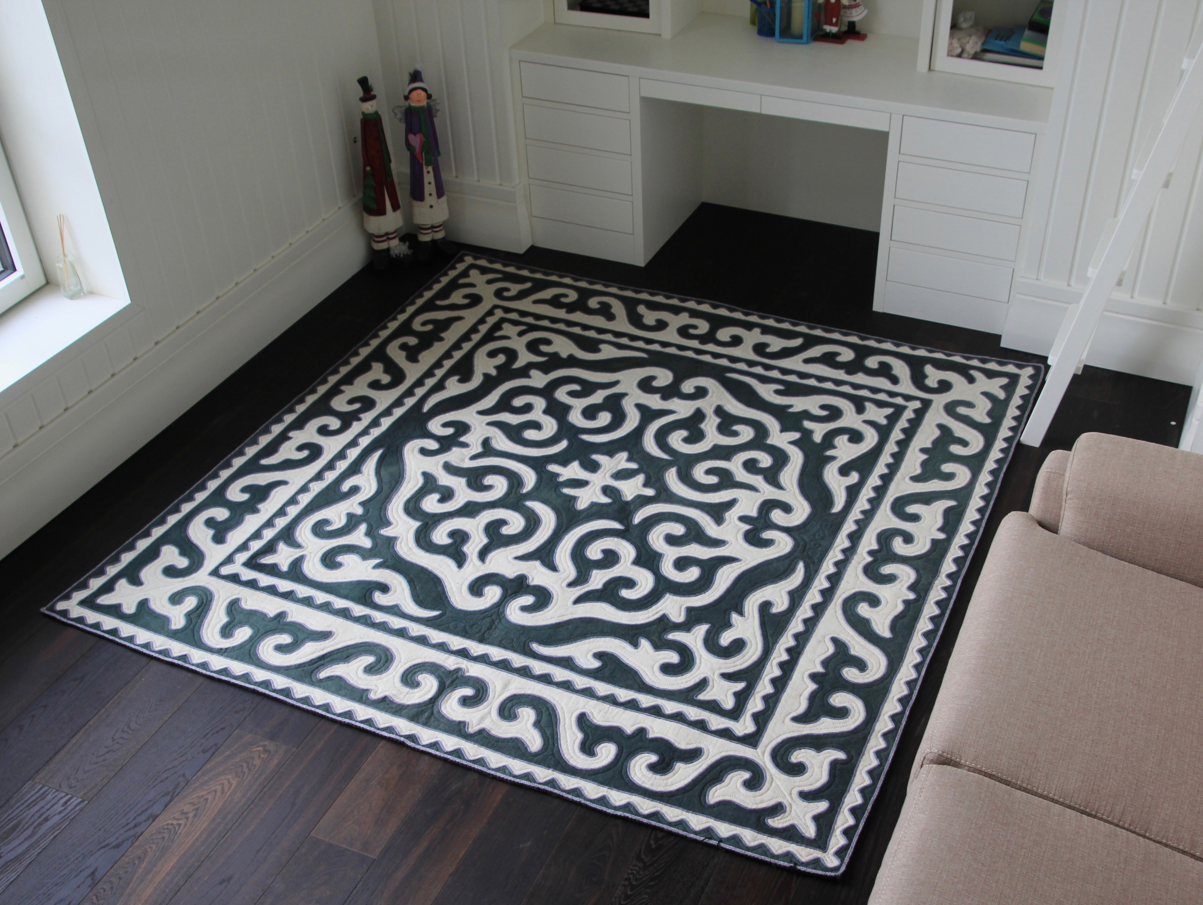 Орнамент вырезается и сшивается вручную, формируя симметричный узор. В композиции преобладают светлые и серые оттенки с мягкими переходами, создающими спокойную и сдержанную графику. Центральный рисунок построен вокруг двух крупных ромбовидных элементов, которые задают структуру и визуальный центр ковра. Боковые и крайние орнаменты формируют плотную рамку, усиливая ощущение устойчивости и баланса. Благодаря плотности и толщине шырдак хорошо сохраняет тепло и служит практичным покрытием для дома.
